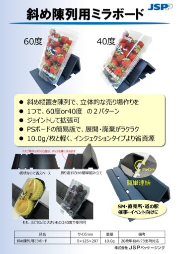 すべて 食品容器 物流梱包資材 その他 反転スタックトレー+BFカバー 斜め陳列用ミラボード イチゴ1段詰めパック 搬送用システムトレー グルメバット 1.3MB 紙グルメ本体レギュラー・ミニ 620KB 紙グルメ中皿30-26 517KB バイキングトレー 589KB 浅型トレー 567KB エビフライシリーズ 552KB テイクアウトボックス20 637KB テイクアウトボックス40 505KB ミラマット 857KB ミラマットA-Bio 504KB 導電性ミラマット 932KB キャプロンシリーズ 1.6MB 断熱・保冷シリーズ 1.6MB ミラボードFLEX 484KB パレットスペーサー 1.1MB 1
